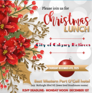 Join us for a festive luncheon and celebrate the holiday season in style!  Wear your favourite Christmas sweater or outfit, enjoy a delicious holiday meal, and spend a fun-filled afternoon with live music and fellow City of Calgary retirees.  We look forward to celebrating with you.